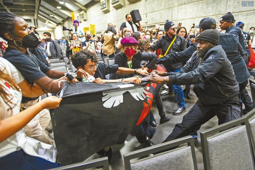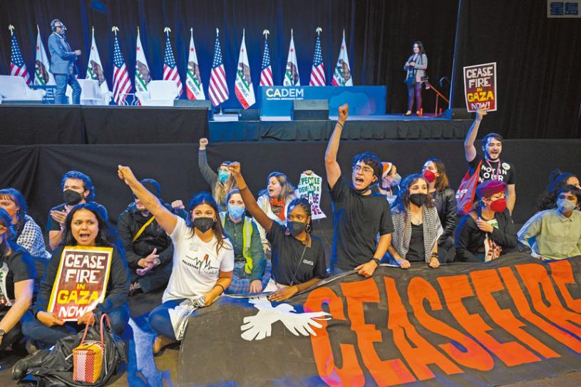 加州民主黨黨代表大會在剛去的周末在沙加緬度召開,討論明年3月初選背書對象。但一群要求以哈戰爭停火的示威者擾亂會議進行,主辦單位以黨代表安全為由,被迫腰斬會議晚間活動。