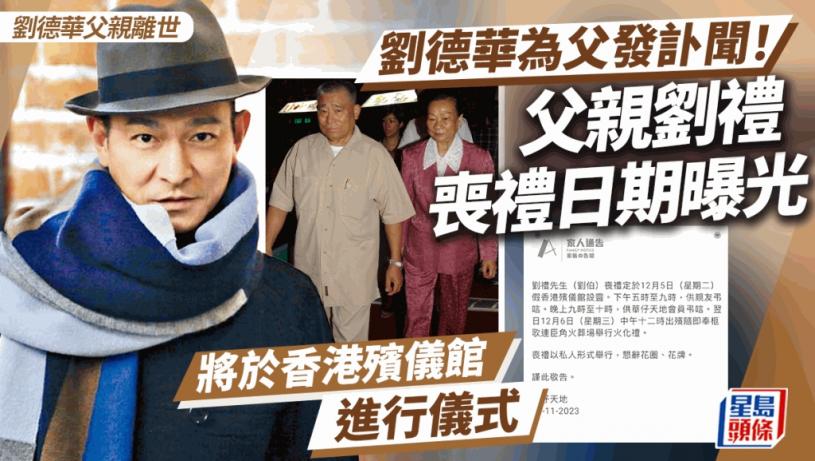 劉德華今日(28日)在「華仔天地」發訃聞,公佈劉爸爸劉禮的喪禮日期: