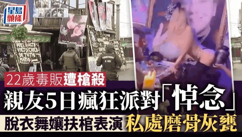 這可能是最瘋狂的葬禮!智利22歲毒販卡洛斯(Carlos Parra)遭槍殺後,親友一連五日舉辦「葬禮」,其中一個在社交媒體直播的節目,竟是請來脫衣舞孃助慶,幾乎全裸地椅着棺材跳不雅舞姿,還一度以臀部和胸部等私密處磨蹭死者的骨灰甕,乖誕程度令人側目,在當地引起爭議。