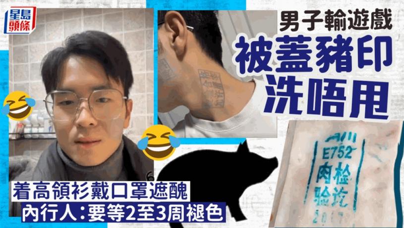 他指,是在上周二(11月28日)朋友從外地回家,與他們玩遊戲時輸了,所以就被懲罰蓋豬肉印章,但蓋了之後竟然洗不掉,他試了酒精、汽油、松節水等去印,但臉上的印章依然沒有擦掉,「現在字體不清晰了,但是顏色暈染開了。」讓他相當崩潰,出門都只能穿高領毛衣、戴上口罩遮掩。