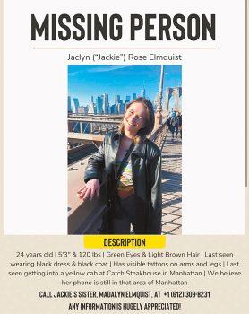警方稱,這名24歲女子的屍體於1日下午在西28街540號的+Art被發現。區內有人貼出了埃爾姆奎斯特的失蹤傳單。