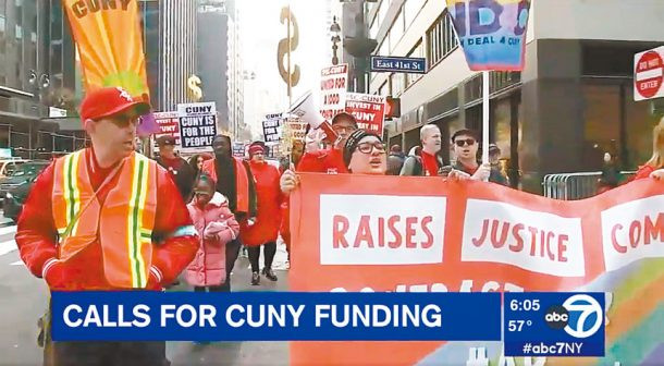 紐約市立大學(CUNY)數百名支持者於2日在州長胡楚位於曼哈頓中城的辦公室外以一片紅海抗議,要求爭取更多財政幫助。
