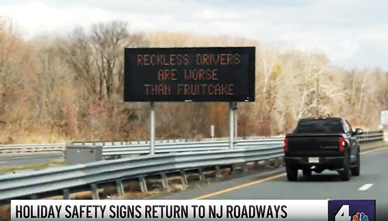 NBC新聞報道,聖誕佳節將至,新州交通廳於感恩節假期前在州內所有高速公路電子廣告牌,打出帶有節日氣氛的趣味交通宣傳標語,包括「開車時發短訊會自動加入壞孩子名單」、「呵呵呵(聖誕老人笑聲),請開慢一點」等,有的則較尖酸刻薄,例如「魯莽的司機比水果蛋糕(譯註:意指瘋人,此為一語雙關)更糟糕」。