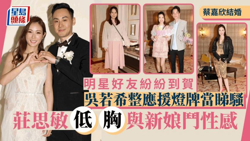 前港姐蔡嘉欣與拍拖7年的男友Derek今日(3日)結婚,不少明星都有現身到賀,當中包括:陳熙蕊、吳若希與老公、王子涵、余香凝、陳約臨、孫慧雪、鄭衍峰及莊思敏等。其中莊思敏與陳約臨打扮最為出眾,莊思敏穿上低胸裙現身,性感程度直逼新娘蔡嘉欣。而前TVB女神陳約臨雖然收起豐滿上圍,但纖腰都非常搶鏡。