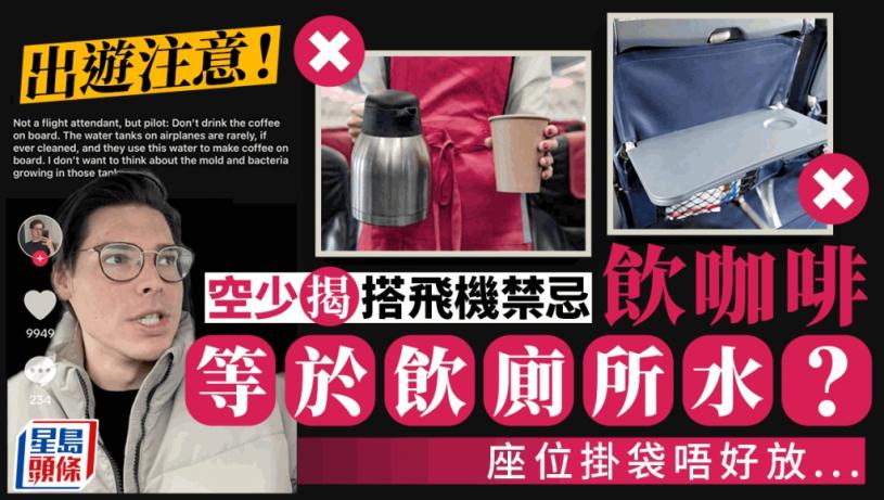 早前有美國網紅空姐拍短片警告,搭飛機時千萬不要喝茶或咖啡,因為機上的水質不乾淨,「那些水箱從來沒有清洗過」。近日再有空少作出同樣呼告,而所揭的內幕更加噁心,提醒機上喝咖啡隨時把馬桶的不潔物喝下肚。