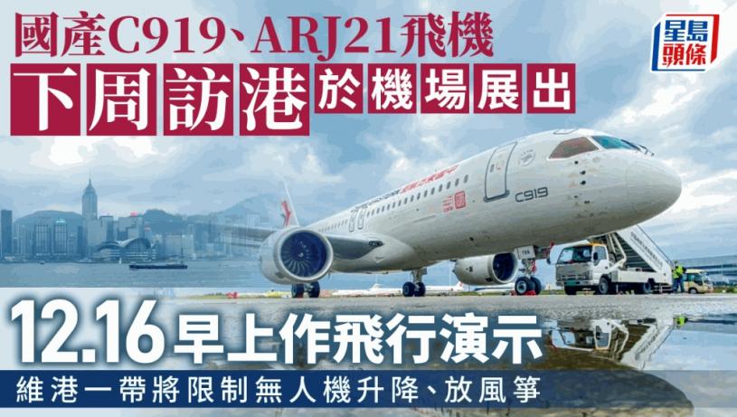兩架國產飛機C919及ARJ21將於12月12日下午抵達香港國際機場,屆時會在機場舉行水門禮迎接,翌日(12月13日)上午民航處及機管局會在停機坪舉行歡迎儀式。在當日下午及隨後兩天,兩架國產飛機會停泊在香港國際機場固定區域範圍作靜態展示,並安排獲邀的海外及本地航空業界代表,以及青年團體、地區組織等代表登機參觀。