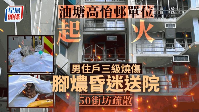 油塘高怡邨高志樓,今(5日)早上約8時,其中一單位起火冒煙。消防接報到場,開動一喉一煙帽隊,約半小時將火救熄,其間疏散約50名居民到安全位置。一名姓王 (71歲)男住客在火警中三級程度燒傷,面部熏黑,腳板底被燒得皮開肉綻,半昏迷被送往伊利沙伯醫院搶救,現時情況危殆。消防正調查起火原因。