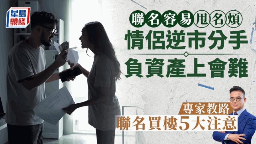 3:雙方需要考慮如未來分手,物業如何處理。如果屆時是打算分手賣樓的話,就要考慮如樓價下跌,負資產是不能出售物業或轉名,除非有資金補差價。舉例,樓價1,000萬元,最初聯名買入時做9成按揭,即900萬元貸款。假設分手時樓價跌至800萬元,那麼便需要補100萬元才可以賣樓或轉名。