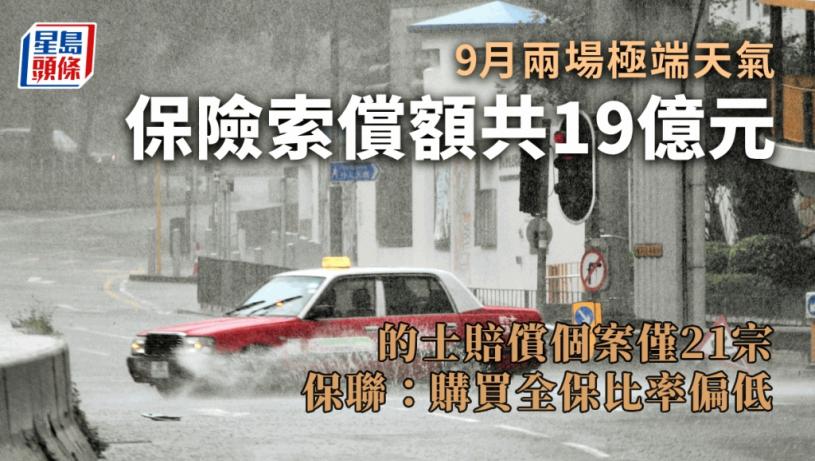 今年9月本港經歷10號風球及世紀黑雨,保監局公布,從保險業界收集到的數據,截至當月底,兩宗事件的索償總額達到19億元,當中3.61億元涉及颱風「蘇拉」,15.4億元涉及黑雨。而財產損壞及汽車為最受這兩場事件影響的兩項業務,分別佔索償總額86%及9%。