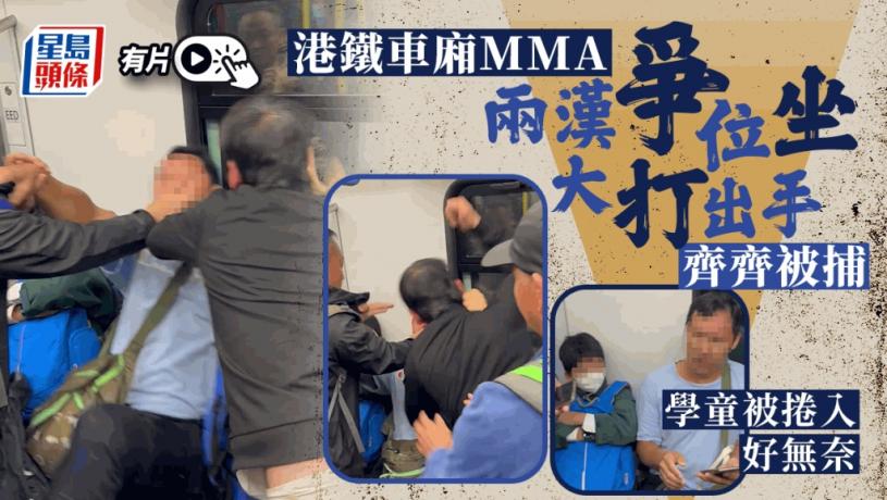 港鐵車廂今早(5日)上班時間,有兩名男子懷疑因座位問題爭執,其後引發「MMA」式大亂鬥,多名乘客隨即勸架分開兩人。拳來拳往之際,一名男學童坐在爭執兩人旁邊,一臉無奈。其後,警方接報到場,將兩名男子拘捕。