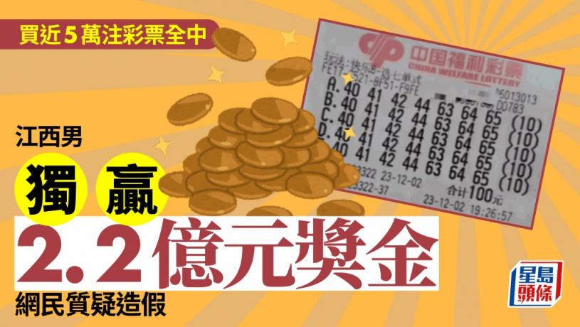 不少港人都會買六合彩,希望可以圓橫財夢。惟內地有民眾投注「快樂8」彩票近5萬注,最終竟全中,獲獎2.2億元(人民幣‧下同),不過有人質疑箇中有無人造假。