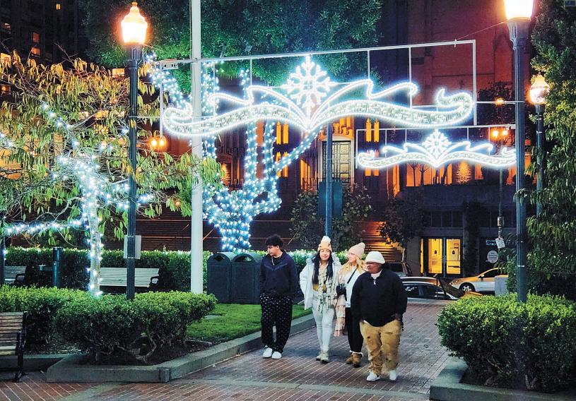 位於三藩市華埠北部的諾布山(Nob Hill)Huntington Park公園為迎接聖誕節,點亮節日燈光,分外浪漫。今年的裝扮不同於往年的彩色燈飾,採用銀色裝點,每個門口處的頂端宛若一個大號的銀色王冠,讓夜晚的公園看上去聖潔明亮。