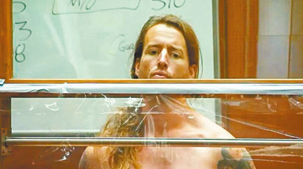 哈斯克爾在洛縣法庭上赤裸上身站立。KTLA