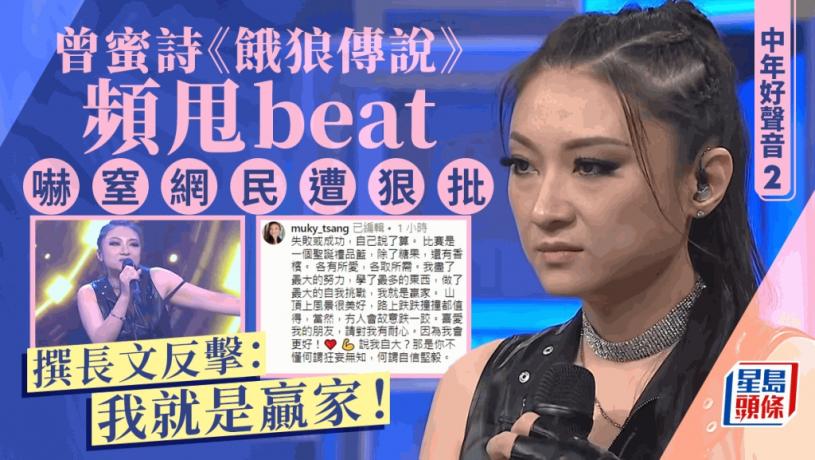 在昨晚(10 日)播出一集《中年好聲音 2》,曾蜜詩以《餓狼傳說》與袁思樂《瀟灑走一回》對戰,一身全黑造型的曾蜜詩rock味十足,可惜一開口「狼叫」已經嚇窒肥媽,連張佳添都尷尬地哈哈笑,曾蜜詩在演出過程表現得相當投入,經常「餓狼」上身地「狼叫」,甚至跌Bra帶,可惜經常出甩beat的情況,最得只得76分跌入危險區!自稱是「素過素人嘅素人」的曾蜜詩,她坦言自己平時甚少聽歌和唱歌,今次決定挑戰自己。事後肥媽狠批她的音準離罩,張佳添亦稱曾蜜詩的演出近乎「甩拍」,令人難以投入去欣賞,伍仲衡更說:「最出事叫嗰個『狼叫』,真係唔係咁。」