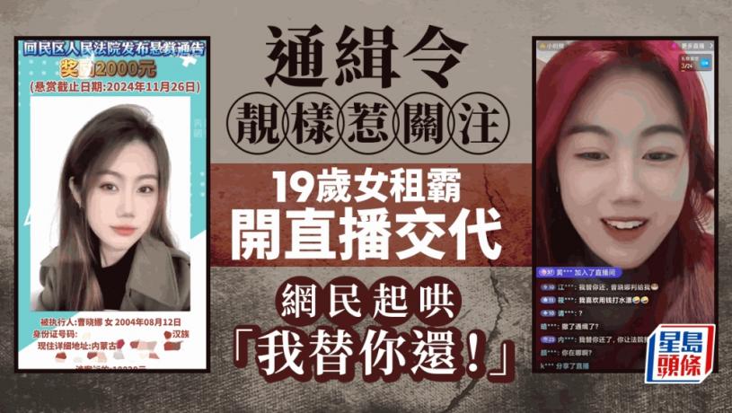 近日一名19歲女子因欠10,028元房租,被呼和浩特市回民區人民法院懸賞通緝,因相貌清秀引發網民關注,被稱為「高顏值女老賴」。該名女子周六現身開直播說明租務糾紛原委,表示年少讀書少不知事性嚴重性,目前已繳清款項。