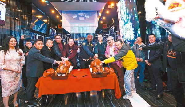 紐約市警務處公共資訊局DCPI局長Tarik Sheppard副警務處長(左六),市警109分局局長Kevin Coleman(左七)率領多位華人高級警官共同進行切燒豬儀式,慶祝新張之喜。圖片由蘇群娟攝