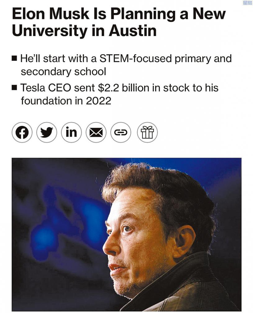 科技大亨馬斯克(Elon Musk)繼移居德州後,有意在當地開辦小學、中學與大學,並且重點傳授科學、科技、工程、數學(STEM)知識。紀錄顯示,馬斯克名下的基金會已經提交申請,並會為此投入1億元。