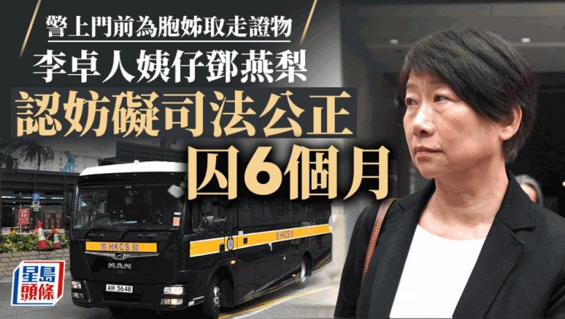 今年3月前「職工盟」秘書長李卓人妻子鄧燕娥涉違反《香港國安法》被捕,其胞妹鄧燕梨在警方到場搜屋前,兩度前往鄧燕娥家中取走手機和手提電腦,早前承認了一項作出一項或一連串傾向並意圖妨礙司法公正的作為罪。裁判官曾慶東今早於西九龍裁判法院判處鄧燕梨監禁6個月。