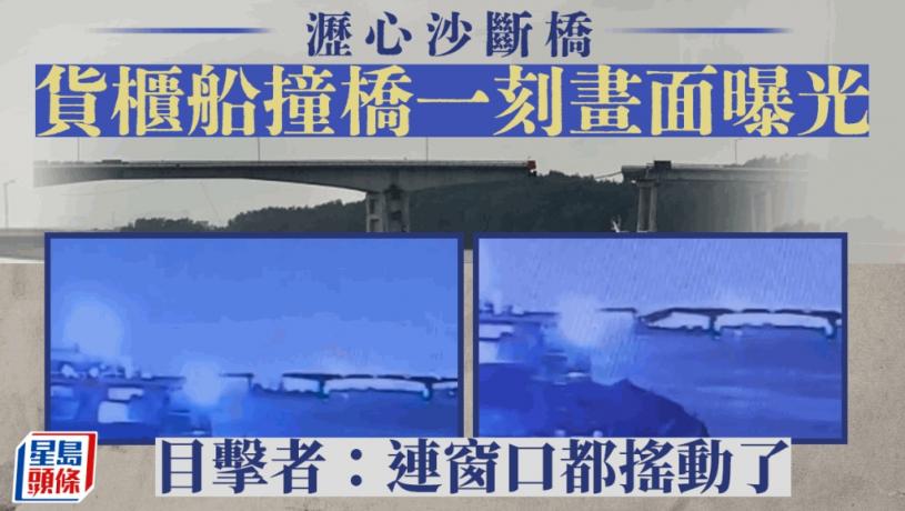 網上影片曝光了貨櫃船撞橋一刻的畫面,從影片可見,船隻撞擊橋身後,橋身斷成兩截,一大面積的橋身墮落水中。