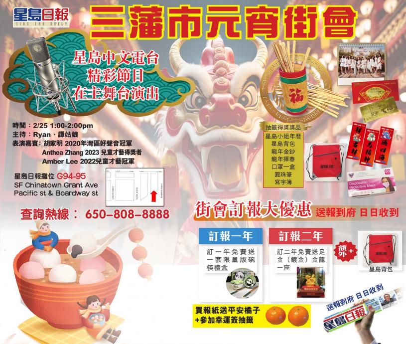 龍騰虎躍迎元宵,金龍獻瑞送吉祥,星島邀您一同歡慶元宵佳節。快來參加2月25日下午1:00至2:00的三藩市元宵街會,我們將在SF Chinatown Grant Ave (Pacific St & Boardway St) 的G94-95攤位等候您的到來。屆時,我們將在星島中文電台主持人 Ryan、譚姑娘的帶領下,在主舞台為您帶來精彩的節目。特邀表演嘉賓包括:2020年灣區好聲音冠軍胡家明,以及充滿天賦的2023兒童才藝得獎者Anthea Zhang和2022兒童才藝冠軍得主Amber Lee。