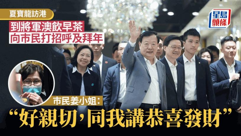 夏寶龍於早上近8時半,在行政長官李家超、青年及民政事務局局長麥美娟、副局長梁宏正陪同下到酒樓。夏寶龍與市民飲茶近一個半小時後離開酒樓。他離開前再向傳媒揮手,及向大家拜年。