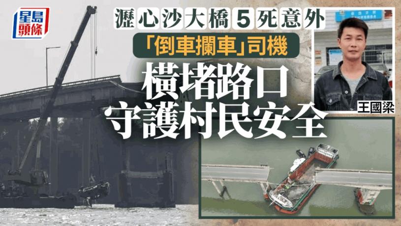 廣州南沙瀝心沙大橋被貨船撞斷,造成5人死亡,2人受重傷留醫,內媒報道,事發時有橋上的駕駛者發生異狀,停車攔後車避免更大悲劇。該名「倒車攔車」車主親述當時折返後將貨車橫堵路口的情況。