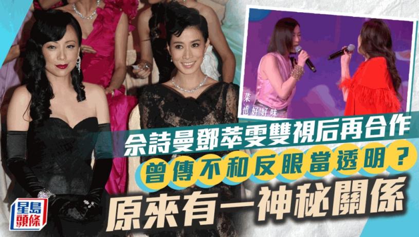 佘詩曼與鄧萃雯先後合作拍攝劇集《酒是故鄉醇》、《金枝慾孽》及《歲月風雲》,鏡頭前同是實力派好拍檔,原來二人同為協恩中學畢業生,是同校師姐妹。不過鄧萃雯比佘詩曼早出道逾10年,佘詩曼上位時一度被指成為鄧萃雯演藝路的威脅,因此一直有傳二人不和。不過去年在內地真人騷《無限超越班》,二人與張可頤相隔18年再重聚,勾起不少網民對《金枝慾孽》的回憶,日前佘詩曼與鄧萃雯再合作為《東方衛視元宵特別節目》表演,節目昨晚播出,二人演唱《分分鐘需要你》,配合上《金枝慾孽》配樂的前奏,短短3分多鐘的演出,即成功引起話題。