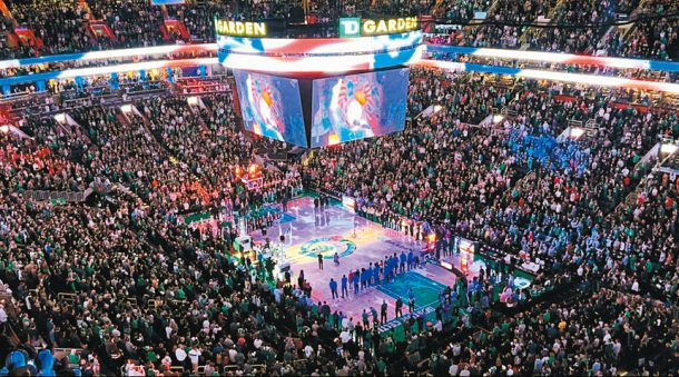 潘美貝爾在波士頓TD Garden兩萬名觀眾全場起立中獨唱美國國歌。 潘潔供圖