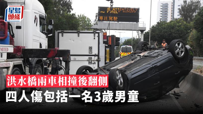 今(25日)午4時許,一輛私家車沿洪水橋洪天路往唐人新村方向行駛,至洪福邨對開時與一輛密斗貨車相撞,兩車失控翻側,私家車一度冒煙,地上遺下深色煞車痕,至少4人受傷包括一名3歲男童。救援人員接報趕至,貨車男司機、女乘客及一名男童一家三口,以及私家車女司機受傷送院治理。