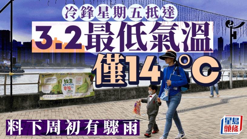 另外,星期六(3月2日)溫度進一步下降,巿區最低氣溫僅得14度,而「自動分區天氣預報」顯示,新界普遍只有11-12度,打鼓嶺更低見9度。另外,天文台又預料一股偏南氣流會在下週初為華南帶來驟雨。