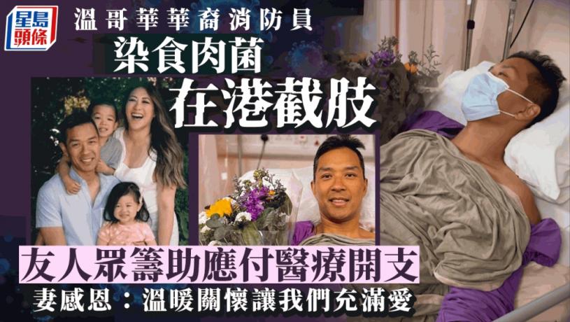 加拿大華裔消防員Christopher Won日前偕妻兒一家四口出遊東南亞期間,因感染「食肉菌」而出現壞死性筋膜炎,轉抵香港後病情更出現惡化,須切除右小腿保命,目前仍然留院。由於他不是香港居民,須付全額醫療費用,加上家庭收入備受打擊,所以夫妻友人在網上gofundme網站發起眾籌,目標5萬加拿大元。