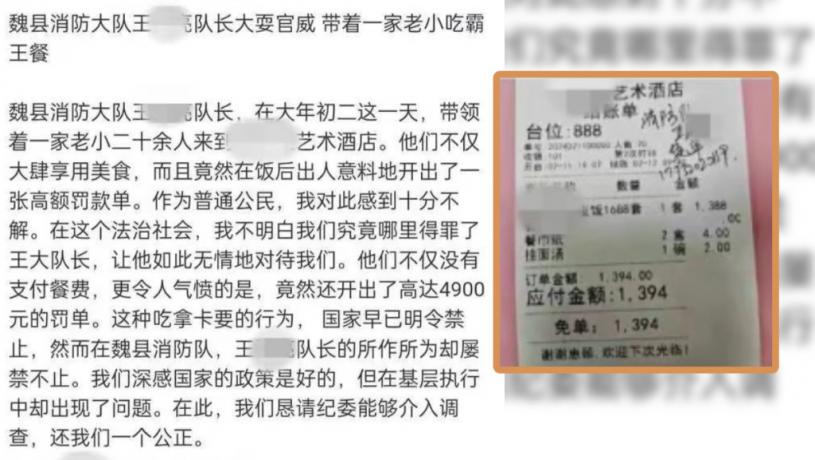 周二(27日),內地網絡熱傳河北「魏縣消防大隊王某某隊長在春節期間耍官威帶著一家老小吃霸王餐」的舉報。該微博稱,涉事人員王某某在大年初二帶著家人,在當地某酒店免費享用了價值千元(人民幣‧下同)的年夜飯套餐,之後,王某某對該酒店開出4900元的罰單。