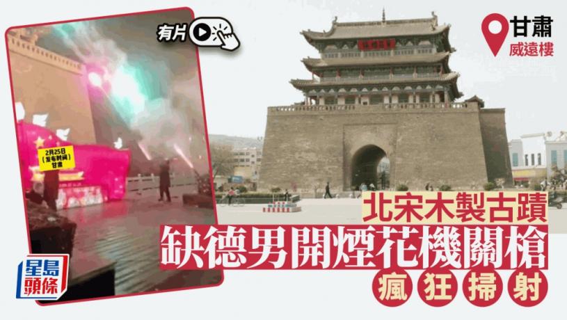 兩男持「煙火機關槍」朝宋代木製建築古蹟「威遠樓」掃射。