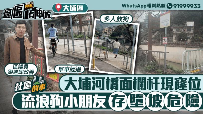 河流兩旁的行人路,一般都有欄杆圍封,確保途人安全。有大埔街坊向「區區有申訴」反映,大埔河其中一個位置竟然沒有欄杆,猶如穿了一個大窿,無遮無擋下存在墮坡危險。區議員跟進事件後,相關部門立即加上鐵欄「填窿」,以免發生意外。