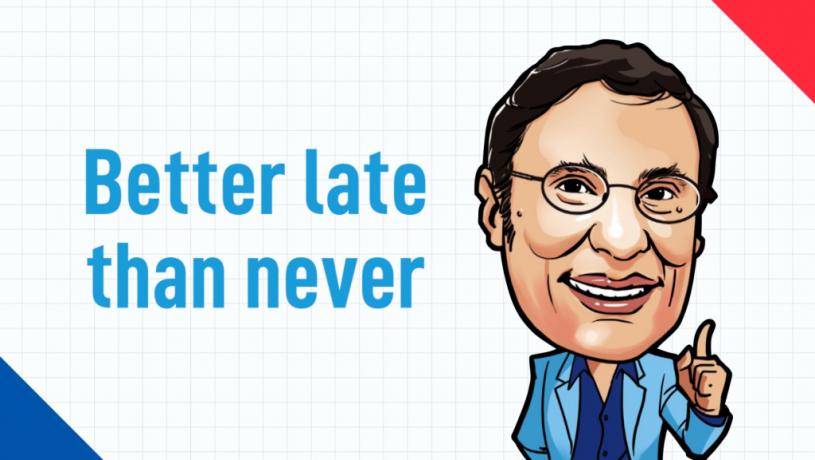 Better late than never.這是一句常見的英語,意即一件事遲做總比不做好。這個習語也可以用來說「遲到好過冇到」,比約定的時間遲來總比不來要好。香港政府將由4月22日起禁止即棄塑膠餐具(tableware)。挑這日子是刻意撞上世界地球日。即用即棄的塑膠餐具(tableware)例如膠碟、杯、飲管、攪拌棒和刀叉等餐具(cutlery),都不能再銷售或提供。遲做總比不做好(Better late than never)!中國內地亦已經禁止一次即棄的塑膠餐具(tableware),歐盟也是。一些美國州分亦已禁止膠袋的使用。