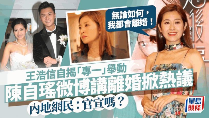 近日王浩信老婆陳自瑤首次做女主角的TVB劇集《婚後事》播出,連日來陳自瑤都在社交平台發文宣傳新劇,不過在微博發布與《婚後事》宣傳文案則引來內地網民熱議。近日陳自瑤接連為宣傳新劇《婚後事》於微博發文:「無論如何,我都會離婚!撕破臉又如何」、「離婚的本錢,從來都唔係錢,而係唔怕做一次x街」、「就算幾鍾意嗰個人都好,都唔需要為咗佢冇咗自己」等。內地網民指看到以上字句出自陳自瑤微博,竟指陳自瑤有種說出心聲的感覺:「我聽著話的意思是說給王某人聽的啊」、「總覺得明里暗裡的」、「明白晒」、「嚇我一跳,以為現實中離婚」、「官宣嗎」,看來內地網民都好關注陳自瑤與王浩信的婚姻狀況。