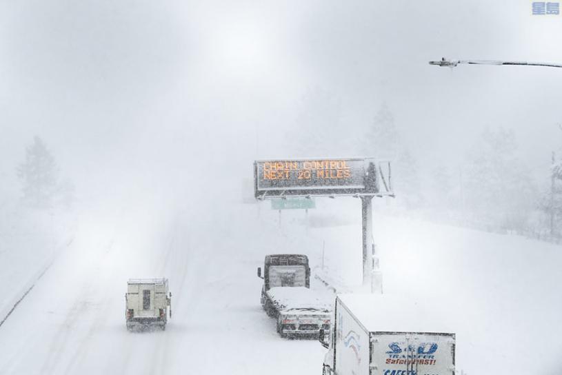 加州公路巡警向80號公路介於雷諾(Reno)與沙加緬度路段實施交通管制,要求司機為輪胎裝上雪鏈。