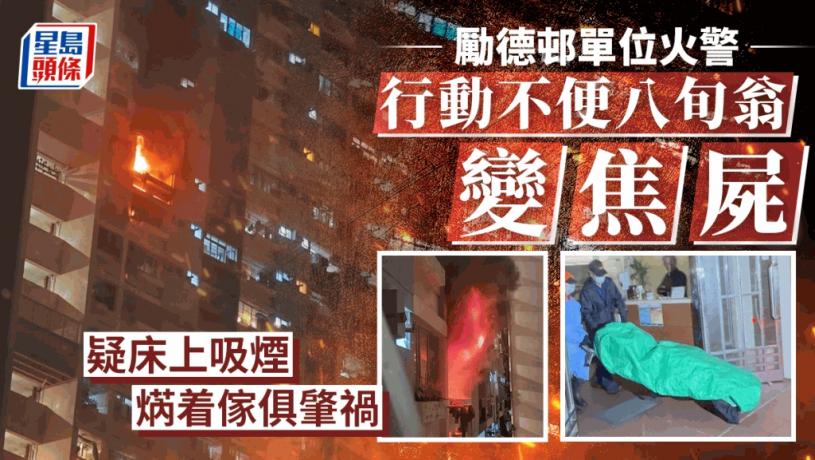 大坑勵德邨昨晚(3日)近10時發生火警,消防接報到場灌救,其後於單位內發現一具燒焦屍體,事件中75名住客疏散。據了解,87歲姓郭男死者為單位戶主,與幼子同住上址。事發時,事主一人留在家中,幼子外出後仍未回家,其後趕回上址了解。據悉,死者有吸煙習慣,早年曾中風,行動不便。