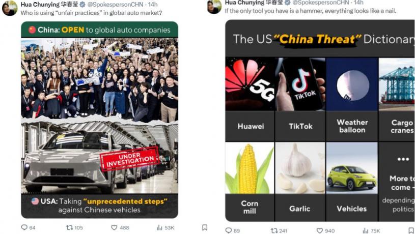 華春瑩之後,又再發圖文並茂的帖文對比中美汽車業的行為,質問「是誰在全球汽車市場採取『不公平做法』」,她表示,中國的做法是「向全球車企」開放,而美國正針對中國汽車採取「前所未有的措施」。