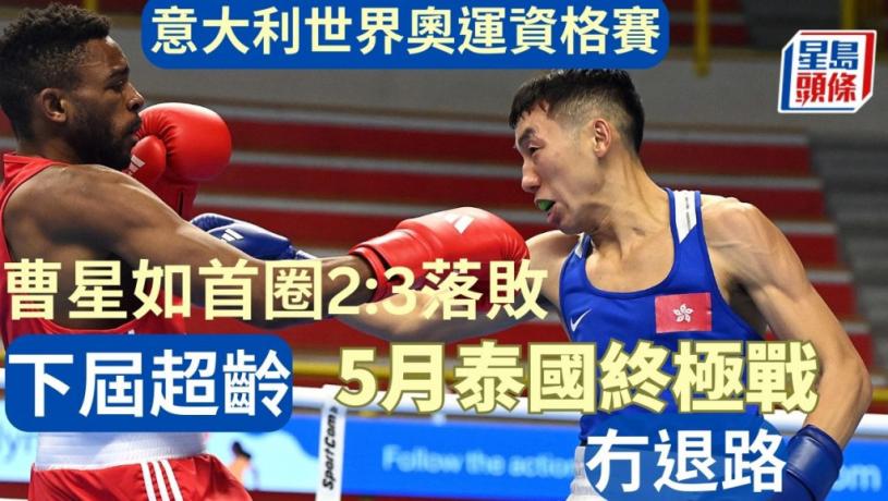香港拳壇「神奇小子」曹星如(Rex)衝巴黎奧運第一擊遭遇敗仗!周一在意大利布斯托阿西齊奧舉行的第1次世界奧運資格賽、男子57公斤級別首圈,以2:3不敵32歲、來自安哥拉的拳手高米斯(Pedro Manuel Gomes),無緣晉級,期望5月底終極一戰能一圓奧運夢;由於奧運拳擊只限40歲或以下拳手參加,下屆奧運他已超齡,巴奧將是今夏滿37歲的星如「最後一擊」。
