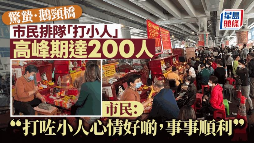 今日(5日)是廿四節氣中的「驚蟄」,按照傳統市民都會「打小人」驅走瘟神。《星島頭條》記者到銅鑼灣鵝頸橋天橋底實地視察,見到現場人山人海,中午食飯時間更非常熱鬧似「趁墟」,現場「啪啪聲」此起彼落,有市民排長龍打小人甚至等候兩個小時亦在所不惜,高峯期近200人在橋底,警員不時巡視秩序。大多市民都希望打完小人,事事順利。