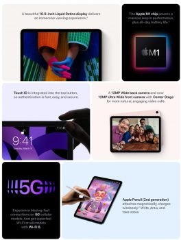iPad Air 第 5 代搭載了強大的 M1 芯片,提供了10.9英吋的液態視網膜顯示屏,支持Wi-Fi 6,並配備了64GB存儲容量。超薄的設計給用戶提供了便攜的舒適體驗。該設備採用了無主頁按鈕的設計,邊框更窄,通過輔助功能,用戶可以自定義虛擬主頁按鈕以適應使用習慣。12MP的前置和後置攝像頭確保了出色的圖像質量,而Touch ID增強了安全性。其全天候電池續航和深空灰的顏色絕對是果粉的不二選擇。另有多種顏色可選。