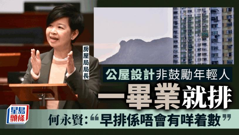 洪雯又詢問當局會否考慮夾心階層的置業需求,特別是令青年有希望上樓。何永賢指公屋的設計絕非讓年青人一開始就輪候公屋,指資助出售單位對於健康的置業階梯是重要的,但眼前5年的公屋供應量少,亦包括資助出售單位,重申現階段重點目標是盡量增加公屋供應,解決之前累積的問題。她又強調,公屋輪候冊已由2017年的15.5萬個跌至12.9萬,跌幅達17%。