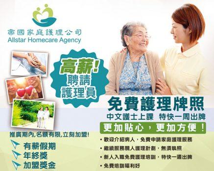 帝國家庭護理公司(ALLSTAR HOMECARE AGENCY, INC.) 現正高薪聘請持牌護理員,薪高糧準,有醫療、獎金、交通津貼等福利,工作時間靈活,多工選擇。歡迎帶老人家加入,並免費為老人家申請家庭護理服務。