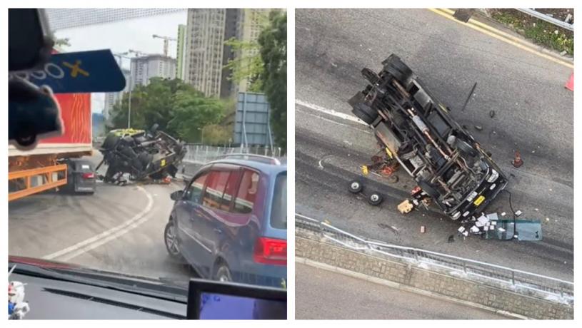 上水發生交通意外。今日(14日)早上8時許,一輛拖車在寶石湖路往文錦渡路方向近彩蒲苑,失事「自炒」撞欄,繼而全車反轉四輪朝天。警方及消防接報指有人被困車內,惟救援人員趕到現場時,發現司機受輕傷,已自行爬出車外。意外原因有待調查。