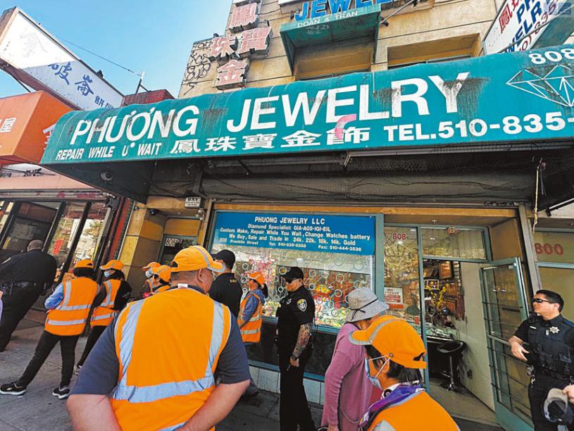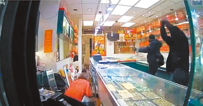 視頻所見,4月10日中午約12時30分,屋崙華埠富蘭崙街的鳳珠寶金飾店(Phuong Jewelry)突然遭8名持槍蒙面男子搶劫。視頻所見,闖入店內的多名蒙面黑衣男子,掄起大鐵錘猛然砸向玻璃飾櫃,其中一名歹徒還向店主舉槍威脅。