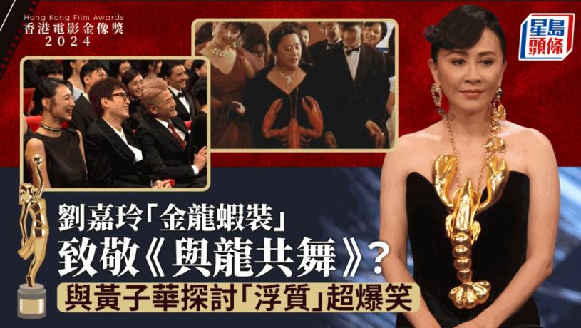 劉嘉玲穿上黑色晚裝,將意大利品牌Schiaparelli 2024年春夏系列設計作品、官方價9,900歐元(約8.27萬港元)金龍蝦掛在胸前,被指是向經典電影《與龍共舞》葉德嫻的「龍蝦裝」致敬。劉嘉玲率先與台下嘉賓討論「專業演員」,被點名的郭富城掛住笑,而坐在他身旁的黃子華則大嗌「潛質」,劉嘉玲聽到對方提到「浮質」,反問是甚麼,黃子華解釋一輪見劉嘉玲仍不明白,即笑說:「我好難同你講。」劉嘉玲之後轉問內地演員大鵬,獲對方回應專業演員要帥氣,卻被劉嘉玲打趣:「長得帥你好像欠缺了一點點」,而余香凝認為「有愛」則獲劉嘉玲認同。