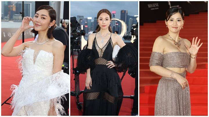 衛詩雅一身低胸白色晚裝,裙邊向橫發展,她笑言無人能站她旁邊,坦言着起來有壓力因裙有很多細魚絲吊著,出場前一秒卻整爛了要即時補救,但很安全不會走光,臨踏上紅地毯前亦要陳家樂幫手整理裙尾讓她走出來更靚。