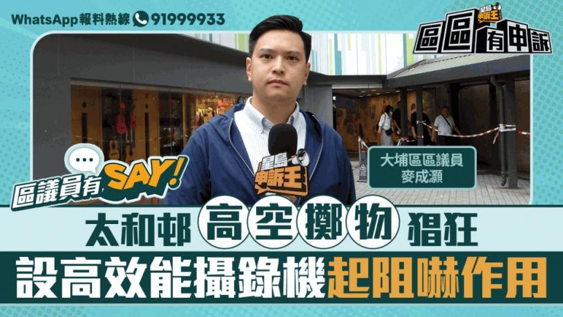 新一屆區議員正式出爐,全新欄目「區議員有Say」將邀請各區候任區議員,反映當區居民最迫切面對的問題。大埔區區議員麥成灝稱,十分關注太和邨的高空擲物問題,因這問題在太和邨存在已久,而邨內其中一個位置,是屬於商場管理公司的管轄範圍,已圍封超過半年,因為這位置長期發生高空擲物情況,「曾試過有人擲下花瓶和咳藥水樽等各種硬物,甚至乎在青年中心門口,麥當勞後面的兒童遊樂場,都試過發生高空擲物情況,亦有小朋友因此受傷。」他希望大廈法團和商場管理公司,可增設高效能閉路電視,可以拍下高空擲物情況,加強阻嚇力,杜絕高空擲物事件發生,「我們亦希望政府誇部門多作宣傳,令高空擲物這個問題,不要再在太和邨出現。」在未來日子,麥成灝稱會聯同星島區區有申訴,跟進街坊各種訴求,跟星島緊密合作。