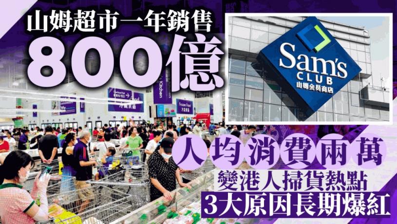 中港去年通關以來,山姆超市一直是港人北上消費熱門地點。據內媒報道,山姆去年銷售額達約800億元(人民幣下同),當中線上銷售佔比47%。若根據山姆2023年公開聲稱逾400萬會員數目推算,800億元的銷售額即意味平均每位會員一年消費達2萬元。